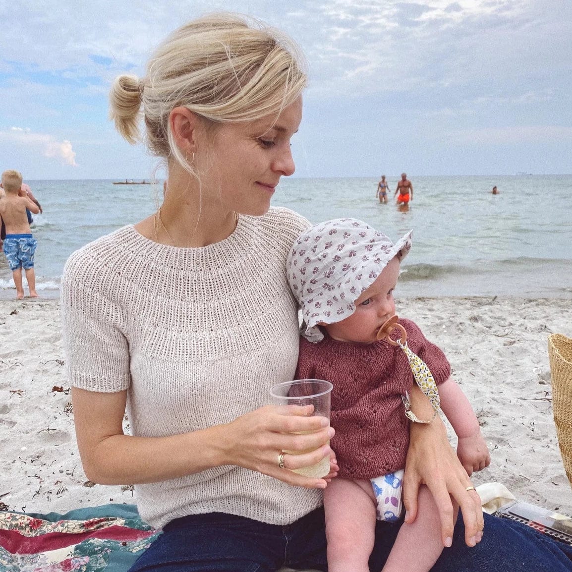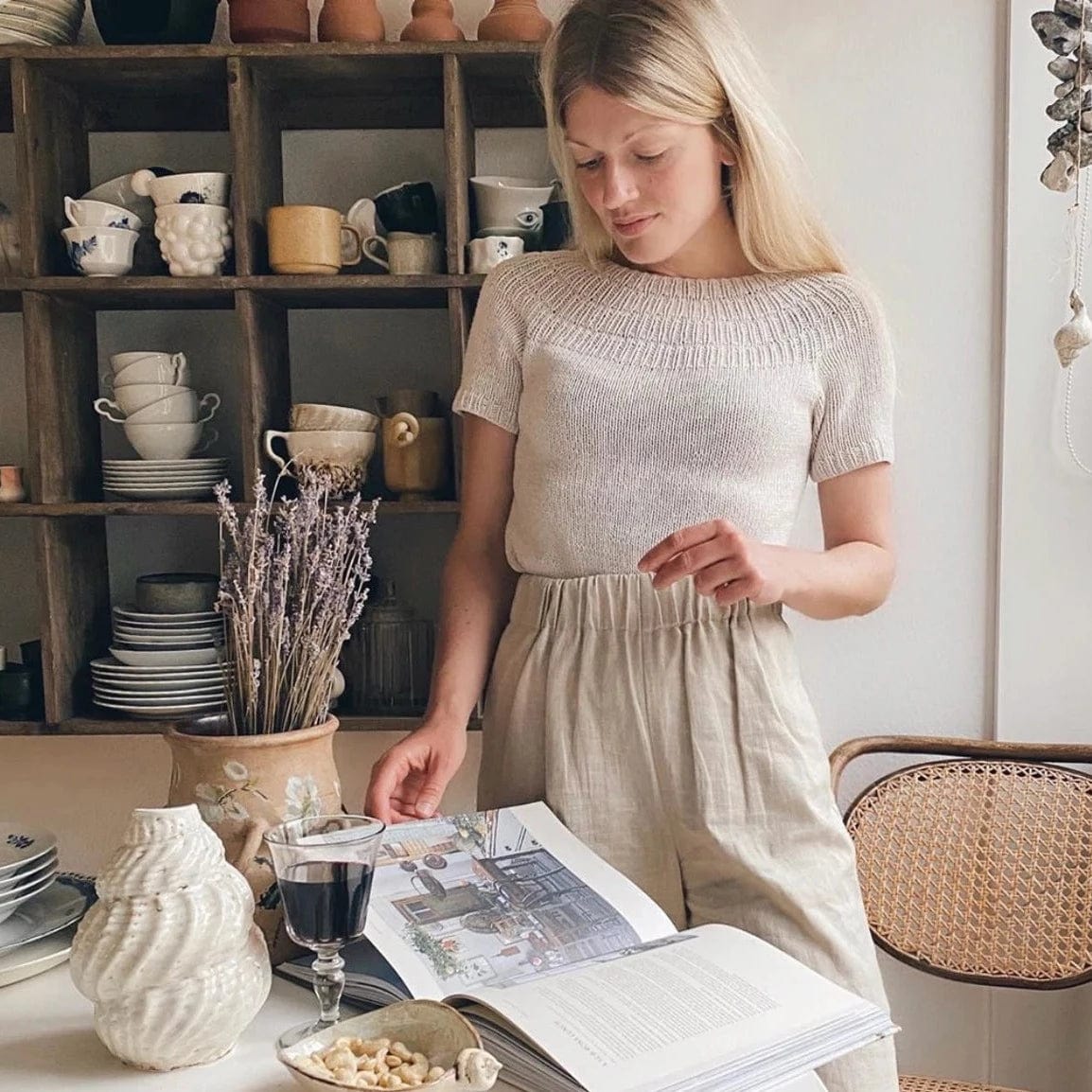 Anker’s Summer Shirt is worked from the top down. The yoke is worked in sections of rib with increases in the round, followed by classic raglan increases when the stockinette stitch section begins. The sleeves are worked at the end, either on double-pointed needles or on circular needles using the Magic Loop technique. Anker’s Summer Shirt has no finishing other than weaving in ends. Begin by working a swatch to determine which needle size you need to achieve the correct gauge. Note that the swatch needs to be washed and blocked before measuring the gauge.