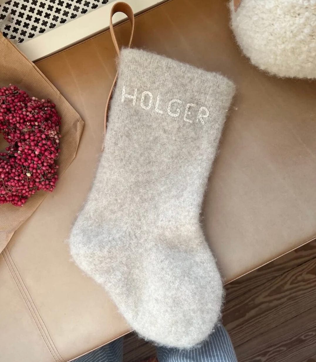 The Christmas Stocking is worked top-down from the leg to the toe. The stocking is worked in stockinette stitch and the heel is shaped using short rows. The stocking is felted at the end before the name is embroidered, the edge is folded and sewn, and a leather loop is attached.