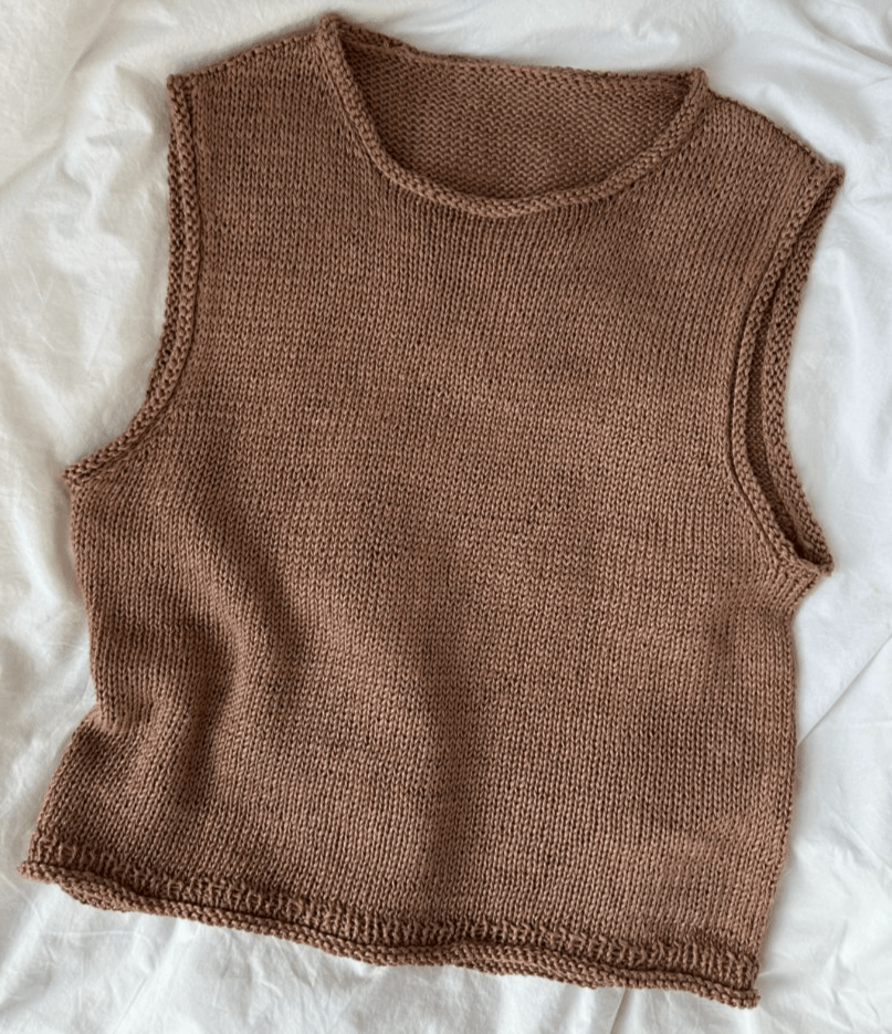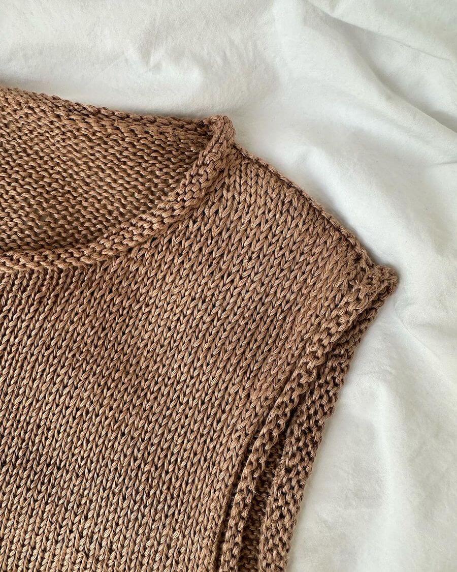 The Cloud Top is worked from the top down. First the back yoke is worked flat back and forth while short rows hare worked to shape the shoulders. Then, each shoulder is worked separately, back and forth and with short rows. The shoulders are then joined to form the front yoke. The front and back yoke are joined at the underarms to form the body, which is worked in the round on a circular needle. Along the neck and armhole stitches are picked up and knitted and a stockinette stitch edge is worked.