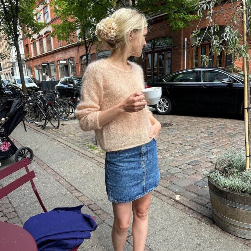The Cumulus Blouse O-neck is worked from the top down in stockinette stitch with two strands of thin mohair/silk yarn held together throughout. The design has a round neckline. All edges are finished with i-cord.