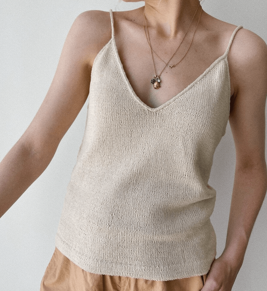 The Cumulus Top is worked from the top down in stockinette stitch. First, four triangles are worked to shape front and back with a V-neck, which are then joined on the circular needle to form the body. The body is worked straight in the round in stockinette stitch and finished with a folded hem. At the end, i-cord edges are worked along the top edges. These i-cord edges are continued into the straps, which are sewn together with Kitchener stitch at the shoulders.