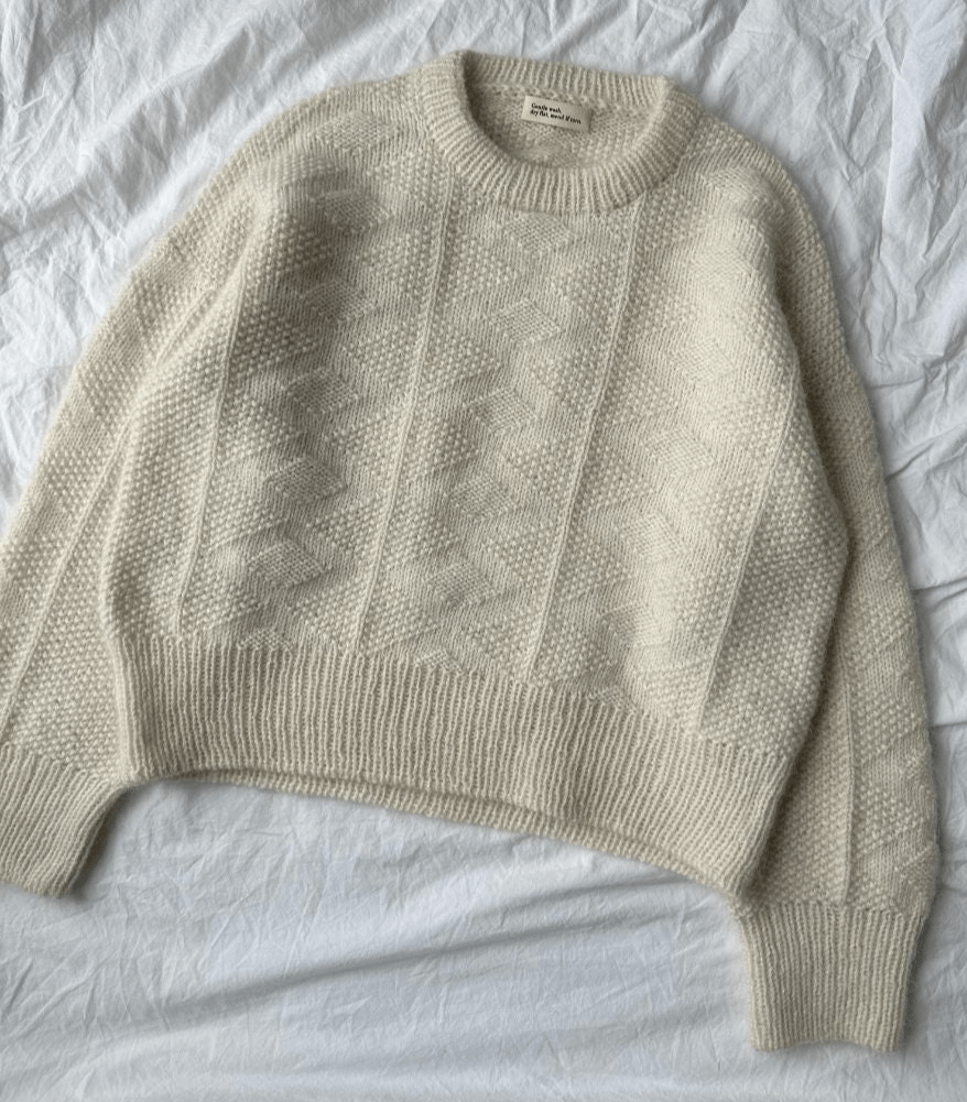 Esther Sweater is worked from the top down in a texture pattern. First the back yoke is worked back and forth with increases. Then the shoulders are worked from stitches that are picked up and knitted along the top of the back yoke. The shoulders are then joined to form the front yoke. The front and back yoke are joined at the underarms to form the body, which is worked straight down in the round. The sleeves are worked in the round on a circular needle from stitches that are picked up and knitted along the armhole openings. A rib edge is worked along the neck edge.