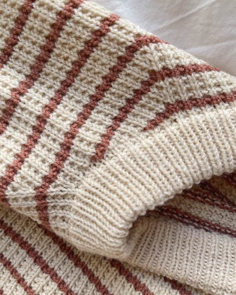Materials: 200 (200) 200 (200-250) 250 (300) 300 (350) 400 g Sunday by Sandnes Garn (50 g = 235 m [257 yds]) for the main colour and 50 (50-100) 100 (100) 100 (100) 100 (100) 100-150 g Sunday by Sandnes Garn (50 g = 235 m [257 yds]) for the contrast colour stripes.