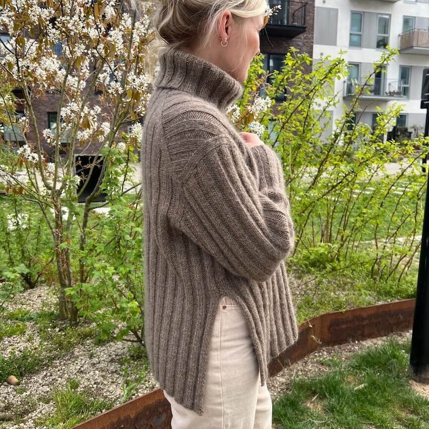 The Hazel Sweater is worked from the top down in rib. First the back is worked with increases. Then the shoulders are worked and shaped using decreases. The shoulders are joined to form the front, and then the front and back are joined to form the body. The body is worked in the round and then split into front and back to form the side splits. The slits start approximately at the iliac crest (top of the hip). The sleeves are shaped using short rows, before they are worked in the round in rib. The turtle neck collar is worked at the end in rib. The pattern also contains instructions for a shorter version without the slits (the yardage on the first page of the pattern is for the longer version with slits).