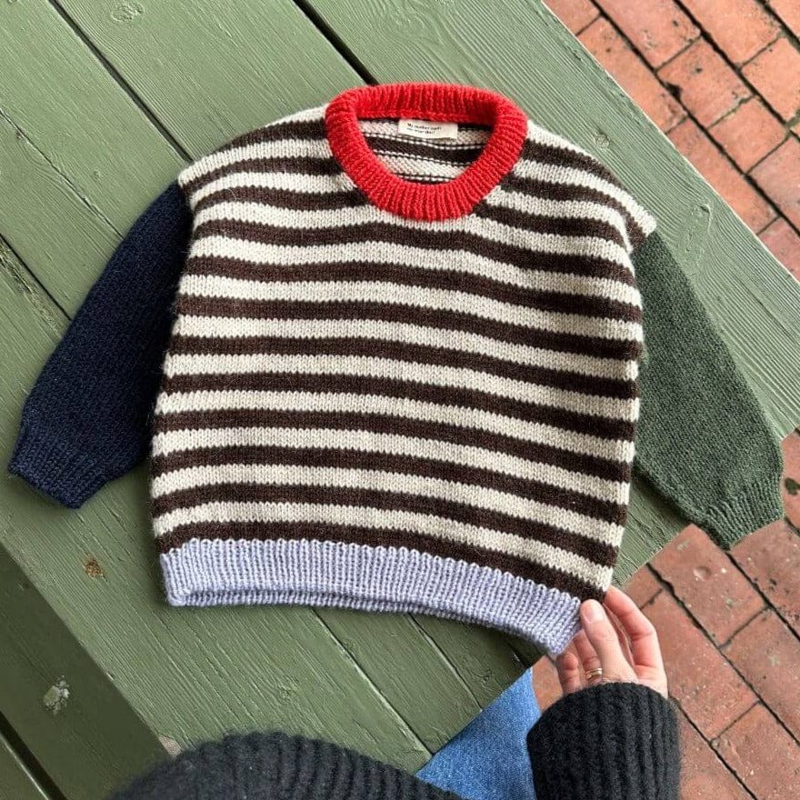 The Holger Sweater is worked from the top down. The body is worked in stockinette stitch with stripes, while the sleeves and neck edge are each worked in a different solid color. First, the back yoke is worked back and forth with the slope of the shoulders being shaped using short rows and in stripes, which are worked at the same time. Each shoulder is then worked back and forth on a circular needle, and then the shoulders are joined to form the front yoke. The front and back yoke are joined at the underarms to form the body, which is worked in the round on a circular needle with stripes. The sleeves are worked down from stitches that are picked up and knitted around the armholes. At the end, a folded neck edge is worked from stitches that are picked up and knitted along the neckline.