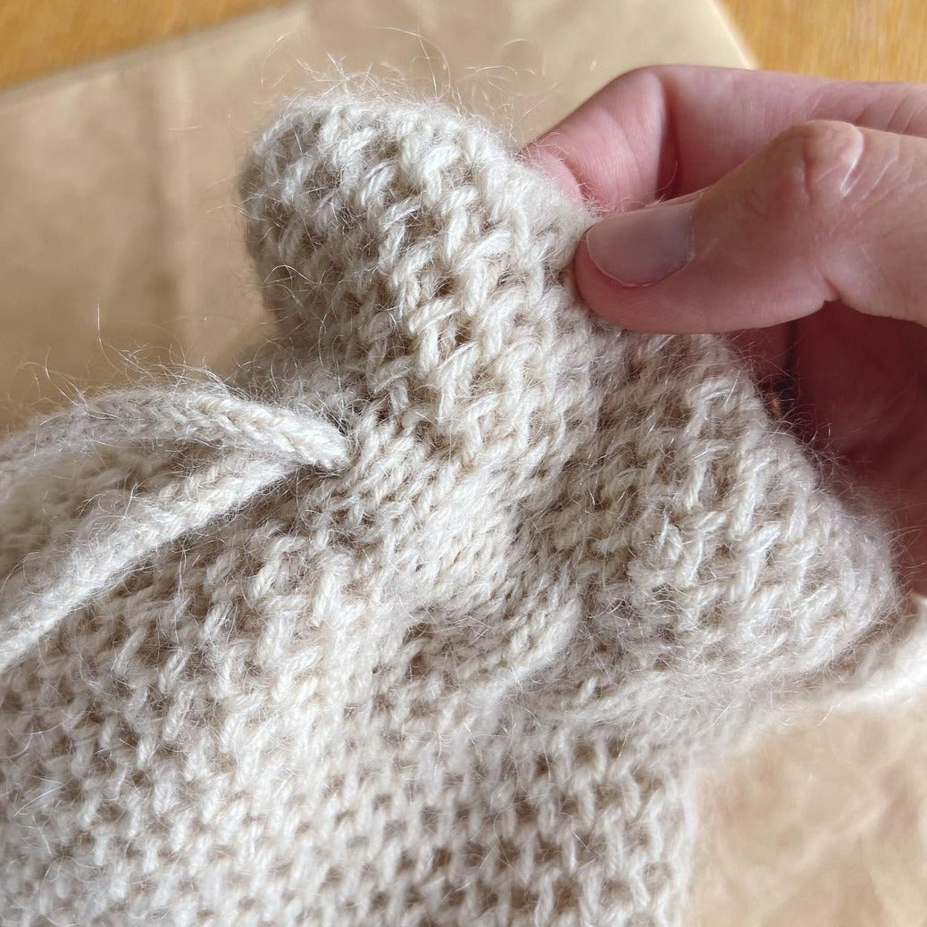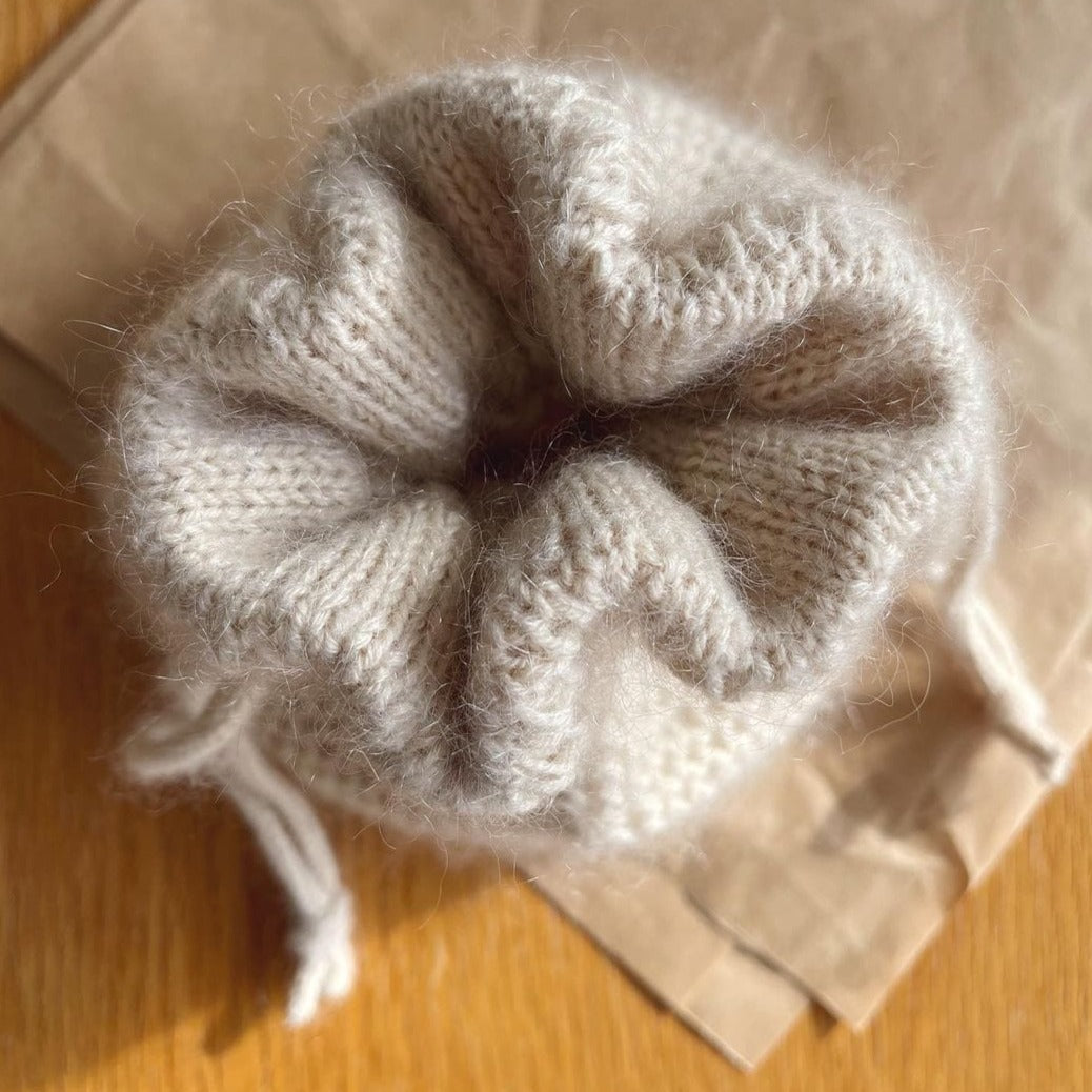 Materials: Approx. 50 (65) g Sunday by Sandnes Garn (50 g = 235 m [254 yds]) (here shown in color Almond 2511) or approx. 56 (79) g Pelsuld 8/2 by Hjelholts Uldspinderi (100 g = 400 m [437 yds]) held together with approx. 27 (33) g Tynn Silk Mohair by Sandnes Garn (25 g = 212 m [232 yds]) (here shown in color Kitt 1015) or approx. 27 (33) g Soft Silk Mohair by Knitting for Olive (25 g = 212 m [232 yds]) or approx. 27 (33) g Silk Mohair by Isager (25 g = 210 m [232 yds]).