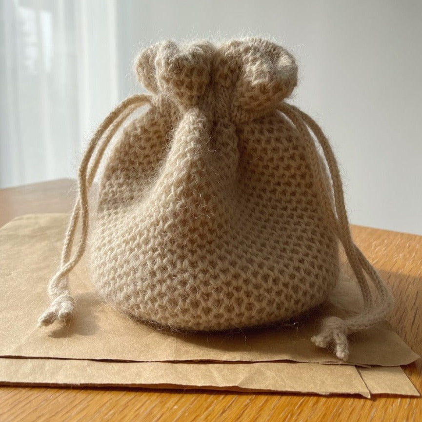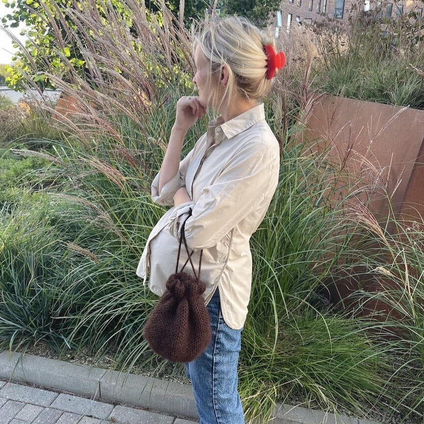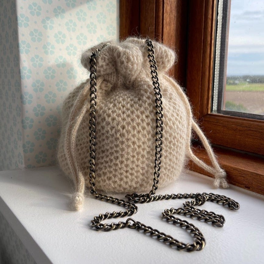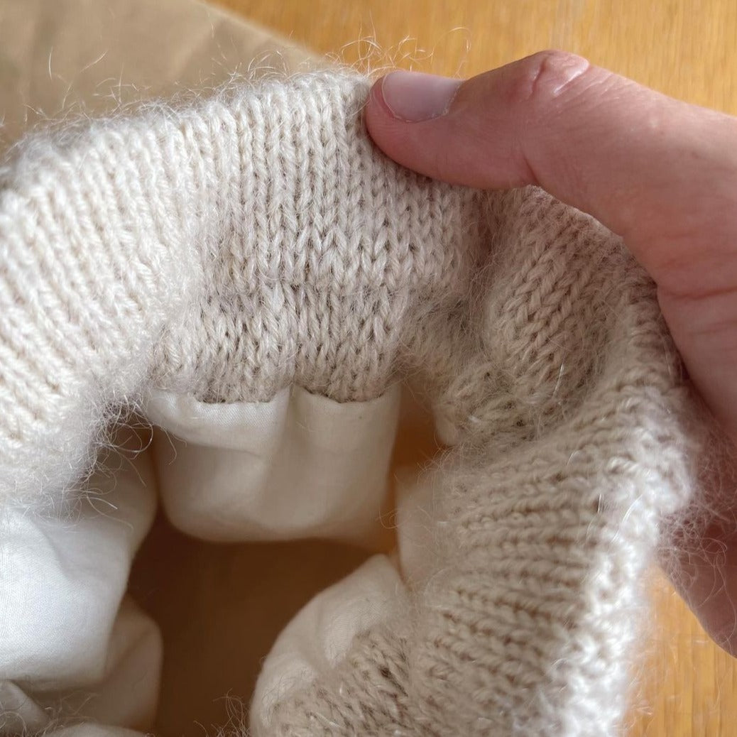 The Honey Bucket Bag is worked seamlessly from the bottom to the top. First the bottom is worked in stockinette stitch, then the sides are worked in the round in honeycomb brioche stitch. The top is worked with a casing for the drawstring. Finally, a lining is sewn and then sewn into the bag. The pattern includes the sewing instructions for the lining.