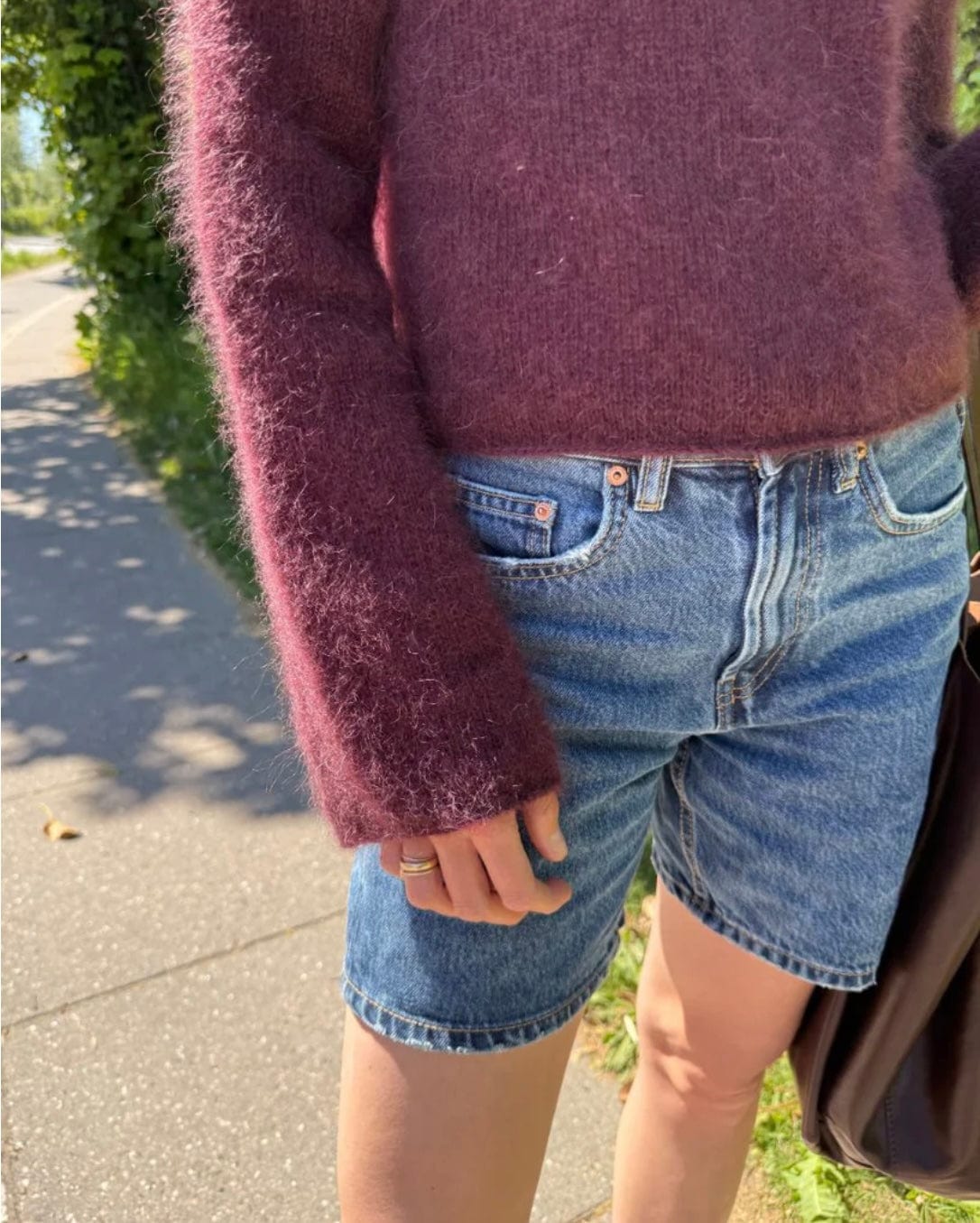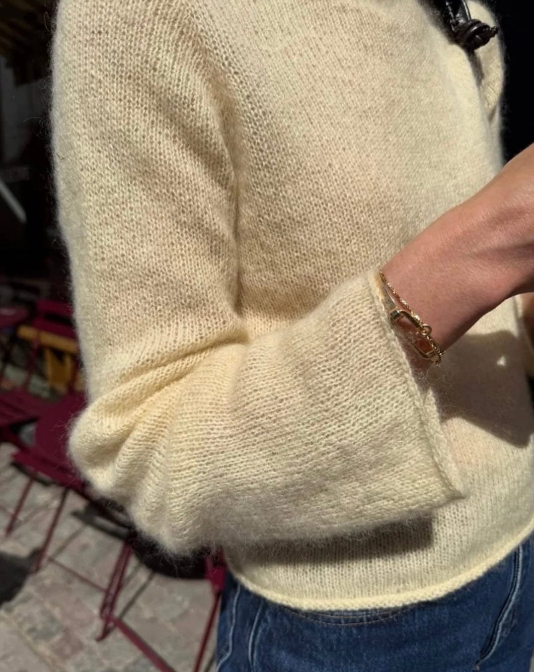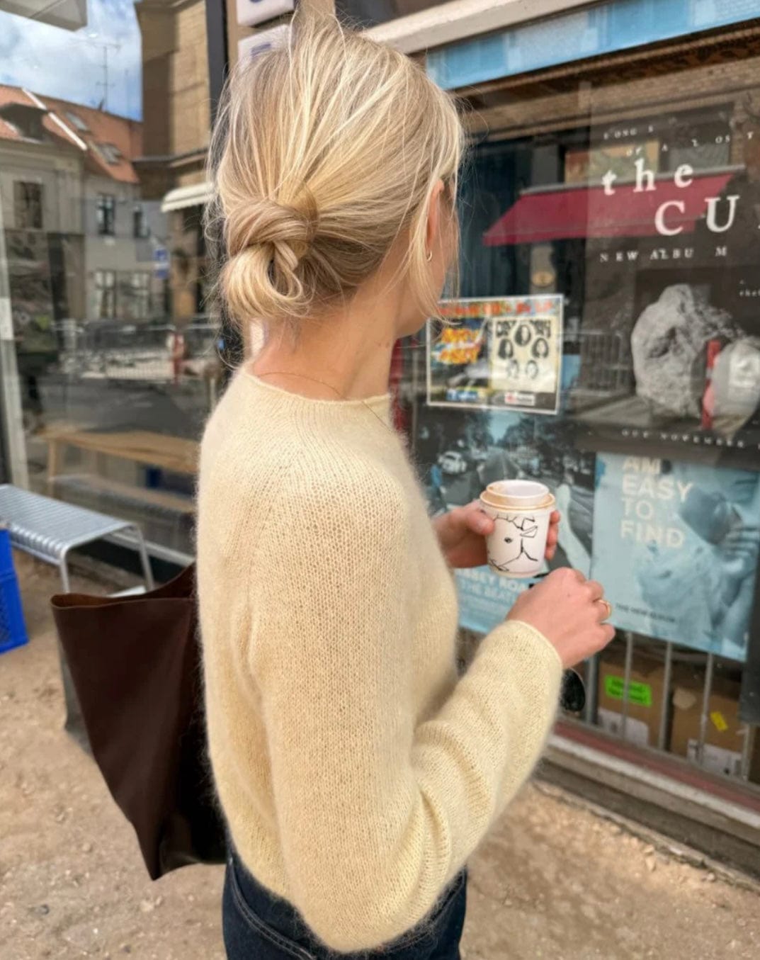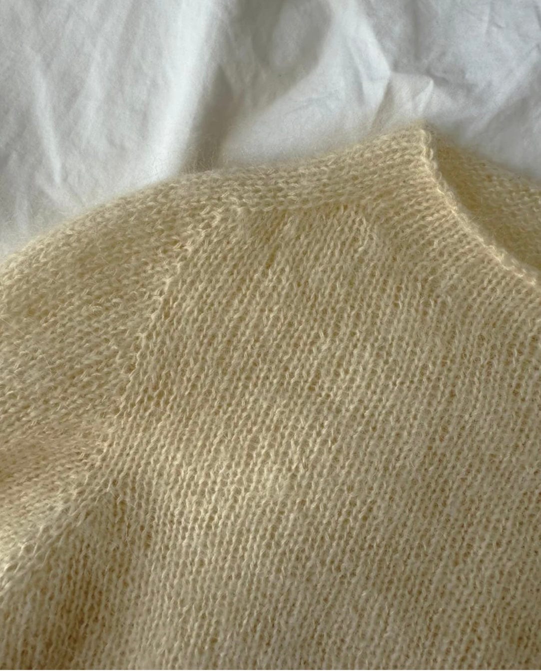 Materials: 140 (160) 160 (180) 180 (200) 200 (220) 220 (240) g Deluxe Silk Mohair by Krea Deluxe (20 g = 240 m [262 yds]) or 175 (200) 200 (200) 225 (225) 250 (275) 275 (300) g Soft Silk Mohair by Knitting for Olive (25 g = 225 m [246 yds]) or 200 (200) 225 (250) 250 (275) 275 (300) 300 (325) g Tynn Silk Mohair by Sandnes Garn (25 g = 212 m [232 yds]) or Silk Mohair by Isager Yarn (25 g = 212 m [232 yds]). Note that the blouse is worked with two strands of yarn held together throughout. The listed yardage is the total yardage needed.