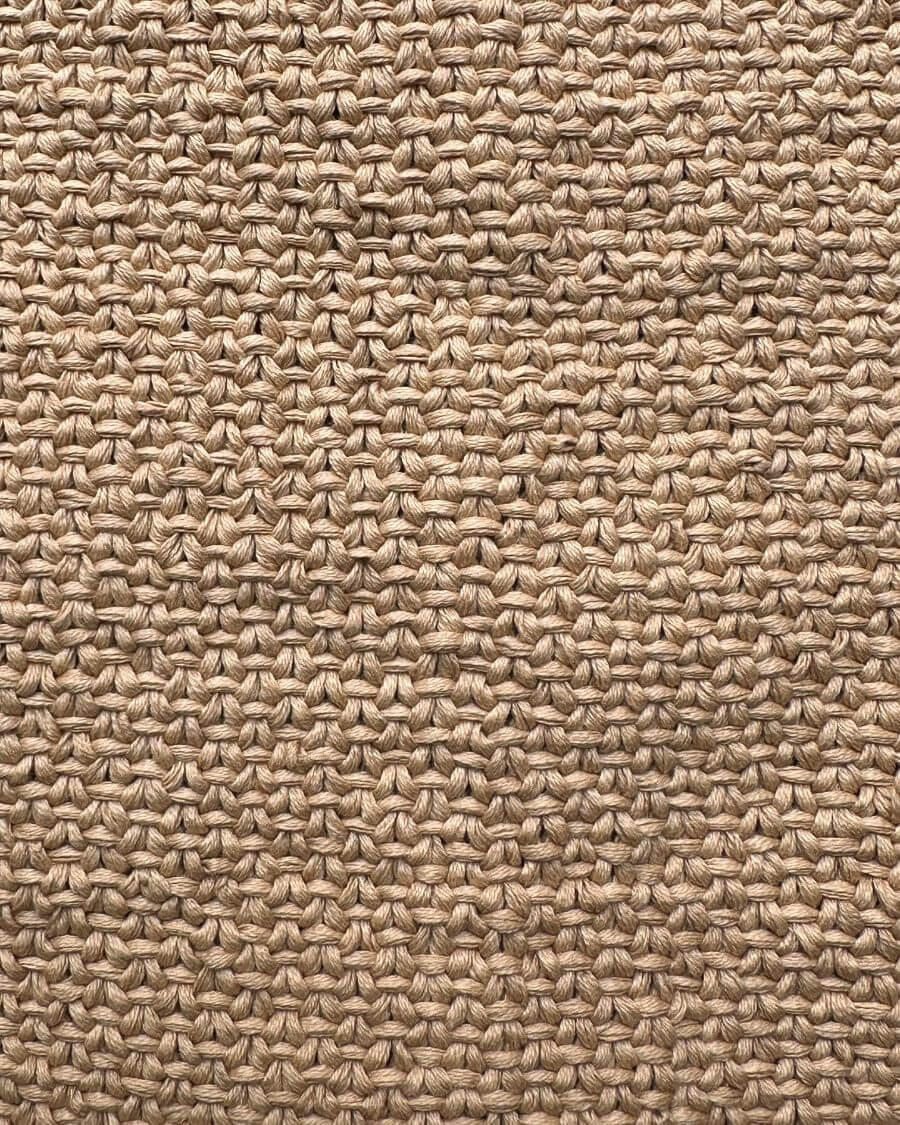 The Sienna Bag is worked from the top down in a slipped stitch pattern with three strand of the recommended yarn held together. The bag is knitted together at the bottom. After this, stitches are picked up and knitted along the sides of the bag and casings for the leather cords are worked.