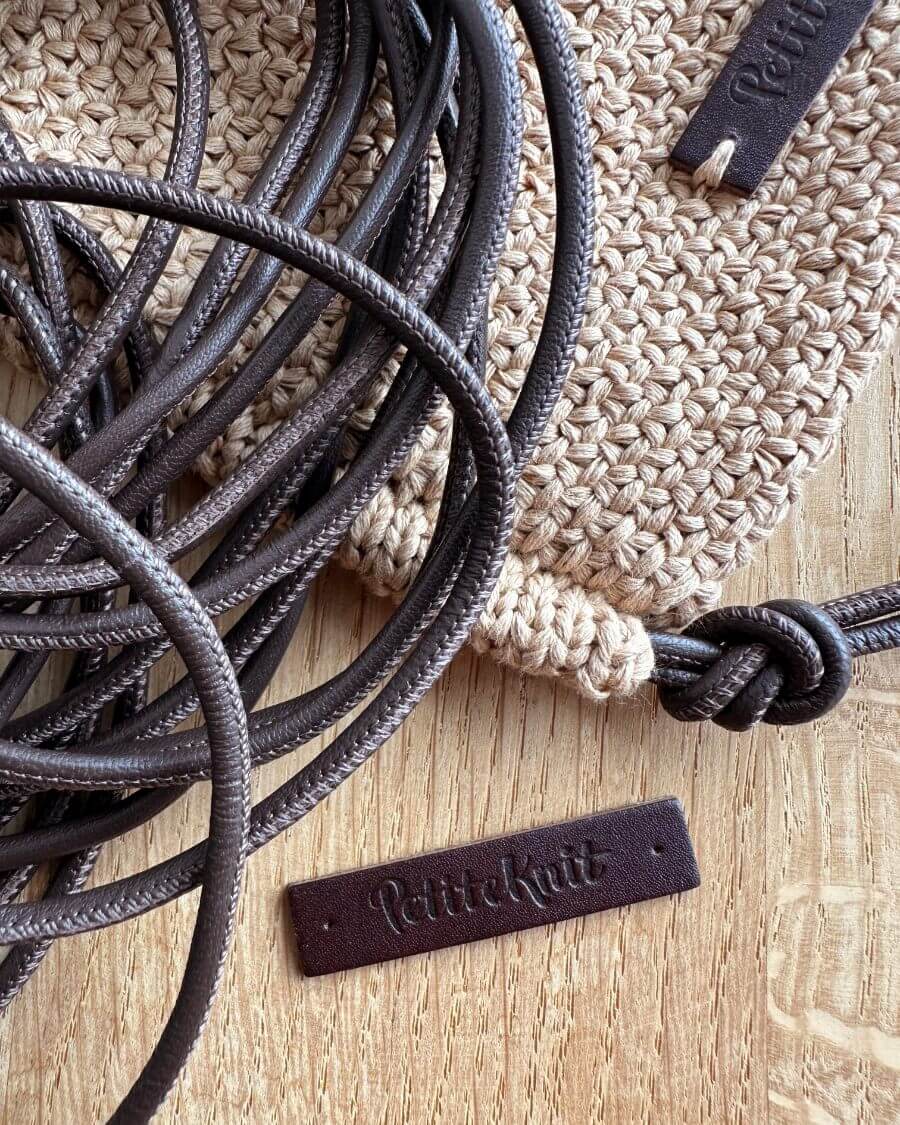 Leather cord (3.7 m x 3 mm [4 yds x ⅒ inch]), stitch holder tubing or cord for picking up and knitting stitches, sewing needle and thread