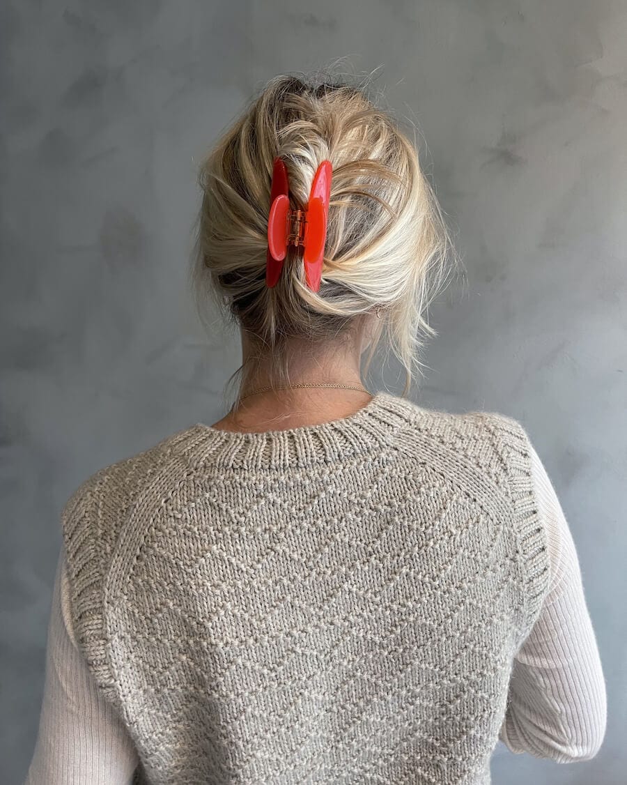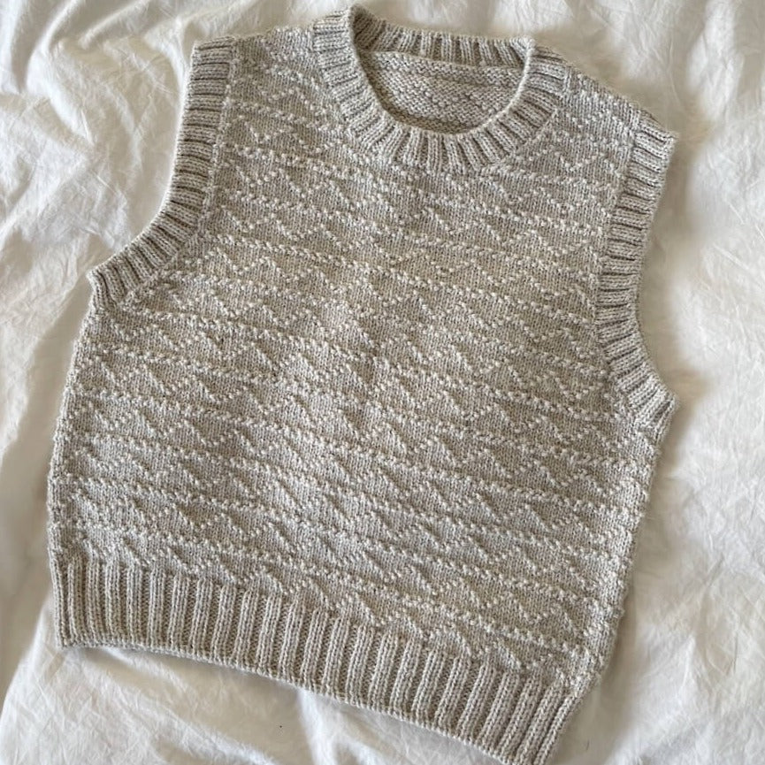 The Sille Slipover is worked from the top down in a knit and purl structure pattern. First the back yoke is worked, then the shoulders, and then the front yoke are worked flat. After this, the front and back yoke are joined and the body is worked in the round, and finally rib edges are worked along the neck and armhole openings.