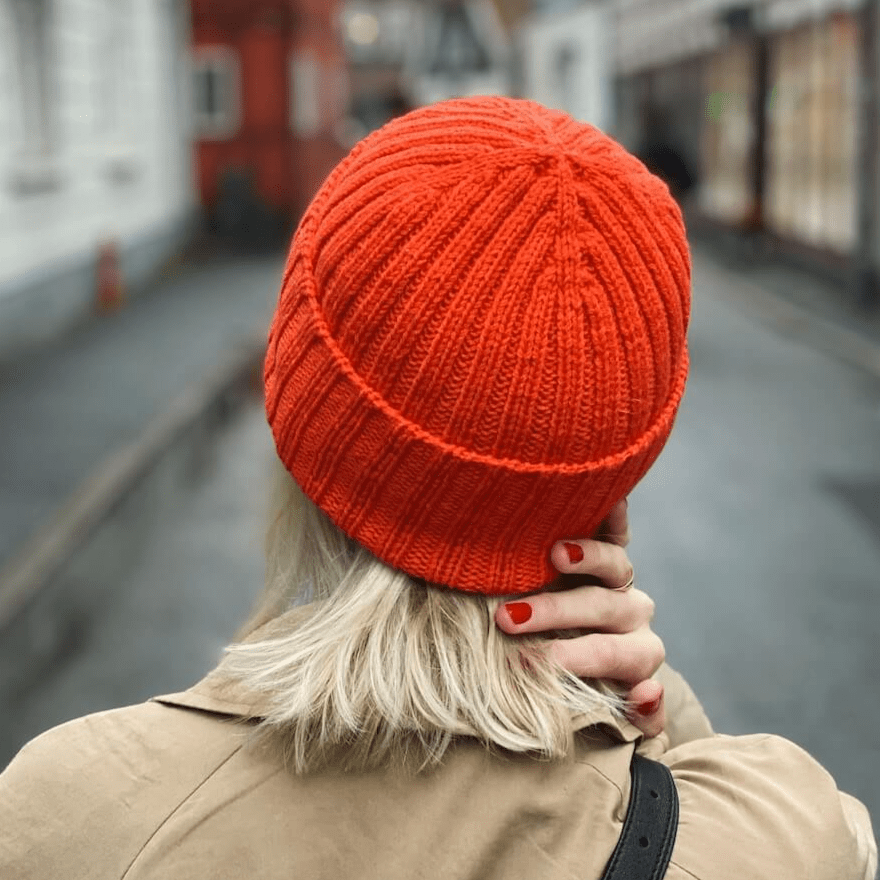 The Hipster Hat is worked bottom up in a 2x2 rib stitch. The bottom has a folded edge of about 6 (6) 8 (8) cm [2¼ (2¼) 3¼ (3¼) inches] (you can do a double folded edge if you knit the hat extra-long, but bear in mind that this will require more yarn than suggested). The decreases at the top of the head are done by working 2 sts together on each side of two knit sts a total of 4 times across the round.