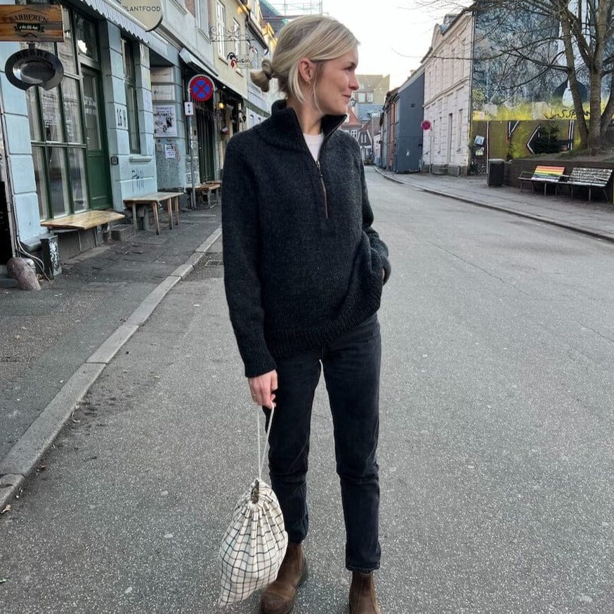 The grey Zipper Sweater Light is knitted in Peer Gynt by Sandnes Garn in the colour Koksmelert [1088].
